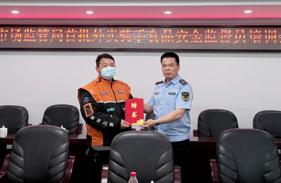 市场监管局工做人员环绕岗亭职责、排查沉点、现患识别及线索流程开展专项营业培训,局带领为骑手监视员颁布聘用证书,积极宣传食安学问。
